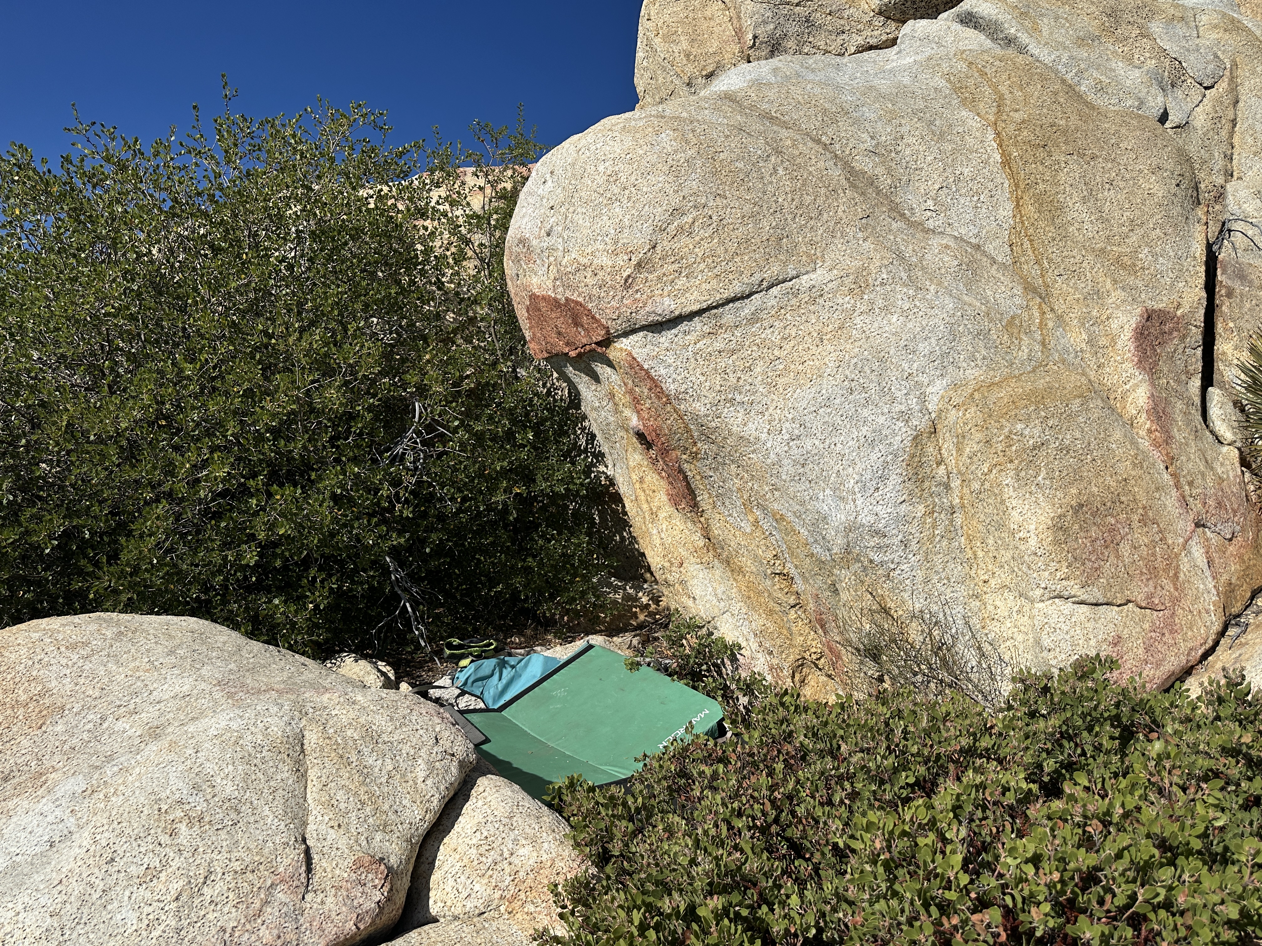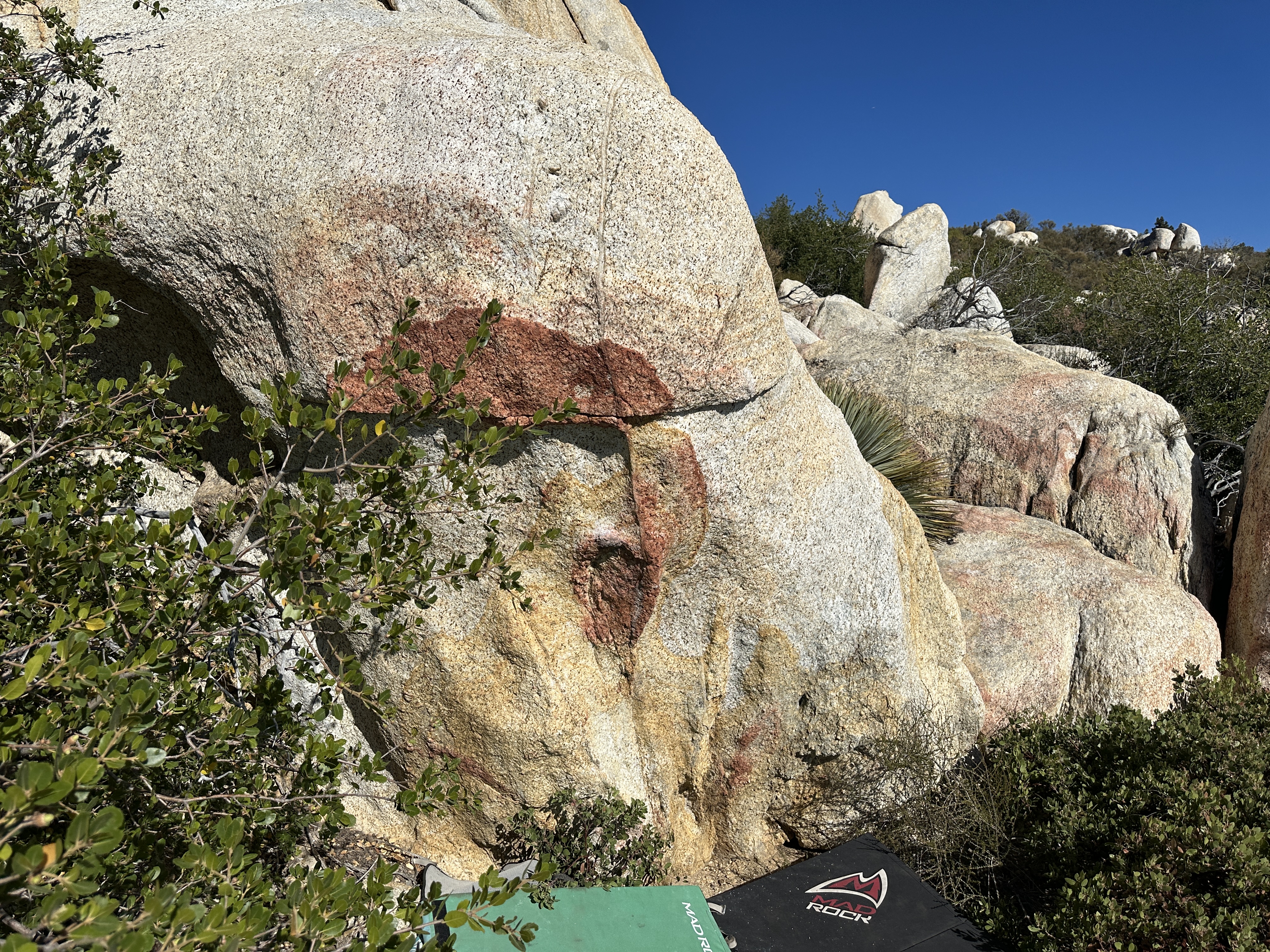 Unique and difficult problem. Gently overhung. Starts with a left hand muffin above a right hand lieback. Right foot is in a shallow pocket. Lurch up and right to a good sloper hold. This sets you up for a dyno to a set of soft feldspar crystals. Reset your feet and get to a sloping dish and find your way to the top using bad slopers. Joshua Tree style sloper top out. WARNING: There is a lot of broken glass on your way back here. Mostly at the end of the corridor.