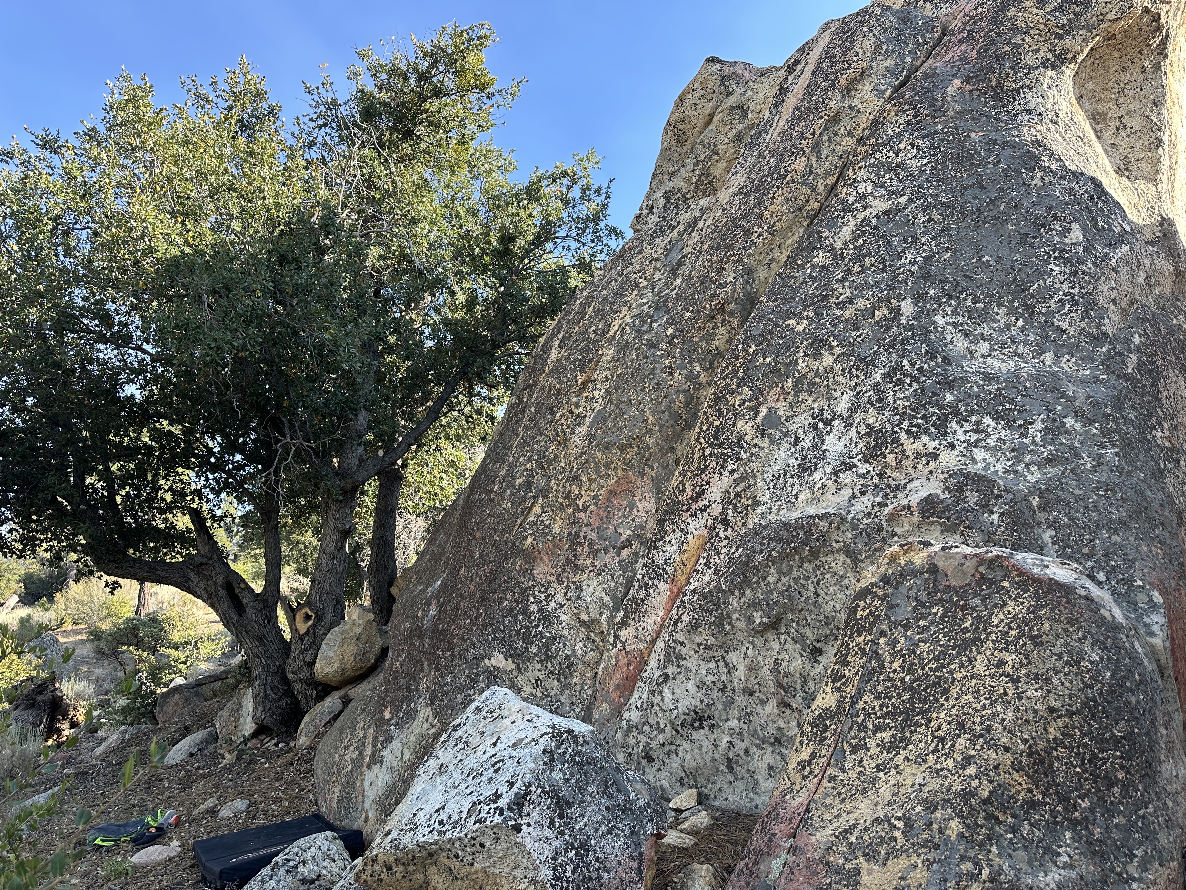 Use a tiny crack and great feet to start. Continue up using the crack, but the arete of the dihedral is off. Just go straight up.