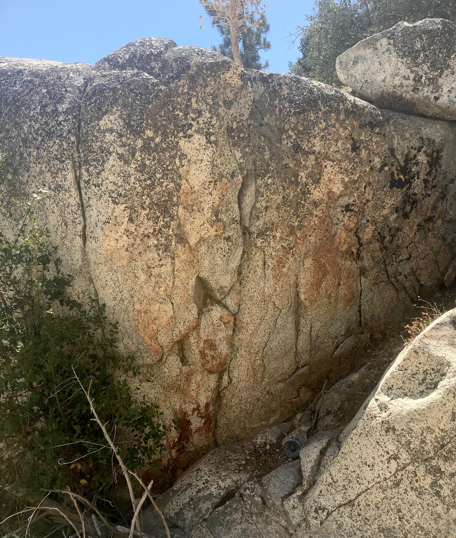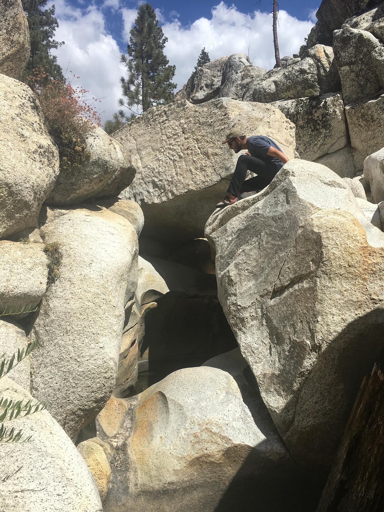 "A good bouldering area called the Sandy Bottom Boulders will be found at Chilao. Directions: Turn into Chilao at Newcomb's Ranch Restaurant and proceed up the road until near the end and park at a yellow gate on the left. Hike downhill past the gate for about 20 minutes. The road turns into a trail and leads to a waterfall. Scramble down the waterfall or around to the left to reach the boulders." -Craig Fry, Southern California Bouldering Guide. Falcon Guides, 1990
