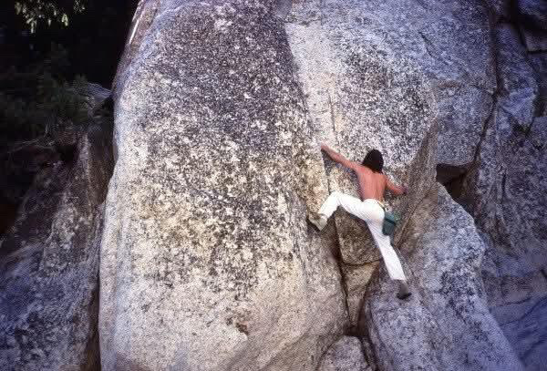 Dave Bruckman climbing at Sandy Bottom Boulders in the Angeles National Forest on approximately January 1980. Photo by Jeff Sewell