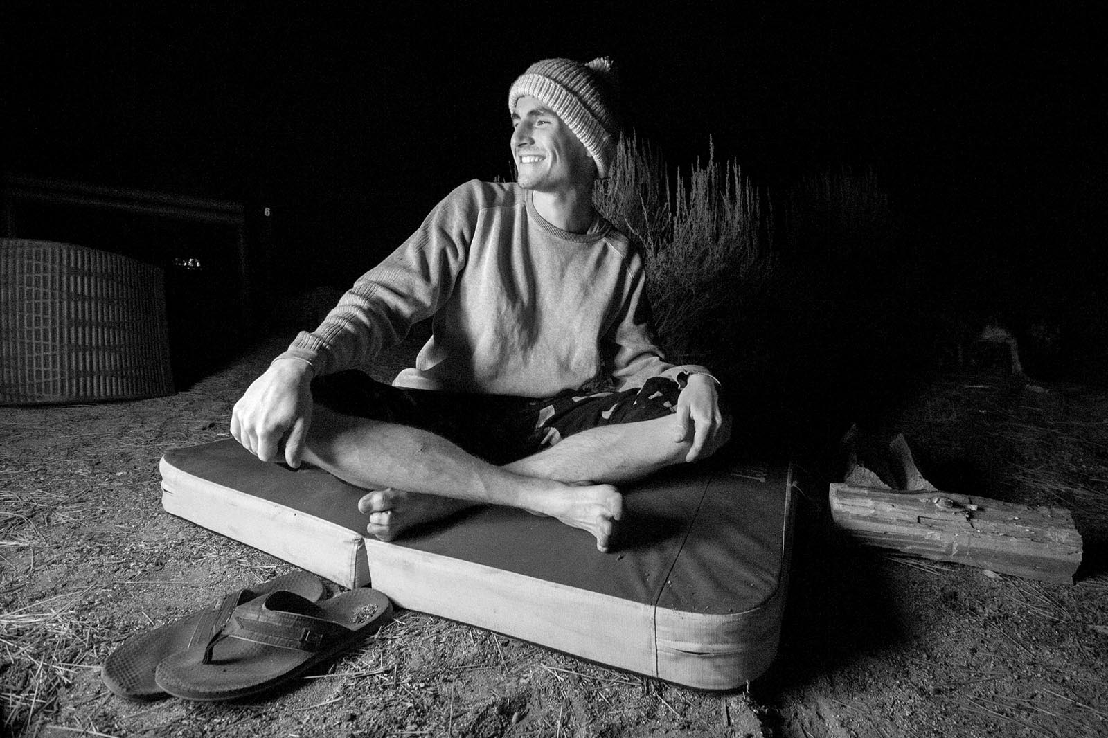 After describing the first ascents of Sword of Damocles and Orange Flambé, Young describes Horse Flats "pioneer" Neal Kaptain, "Kaptain, a quiet spoken vegan, had moved west from Colorado to Beverly Hills. Like March, he was a Venice Beach habitué, and found that the acoustics in the local sewers made for great drumming parties. At Horse Flats, his favorite place to climb, Kaptain established the micro-edged Mr Skin (V7), one of the hardest problems of his era. Kaptain likely could have bouldered harder, but was satisfied to enjoy the solitude of evenings alone on the clean granite among the coulter pine and agaves. 'I just kept bouldering up there and never saw anybody,' he says. 'It was kind of a retreat for me.'"