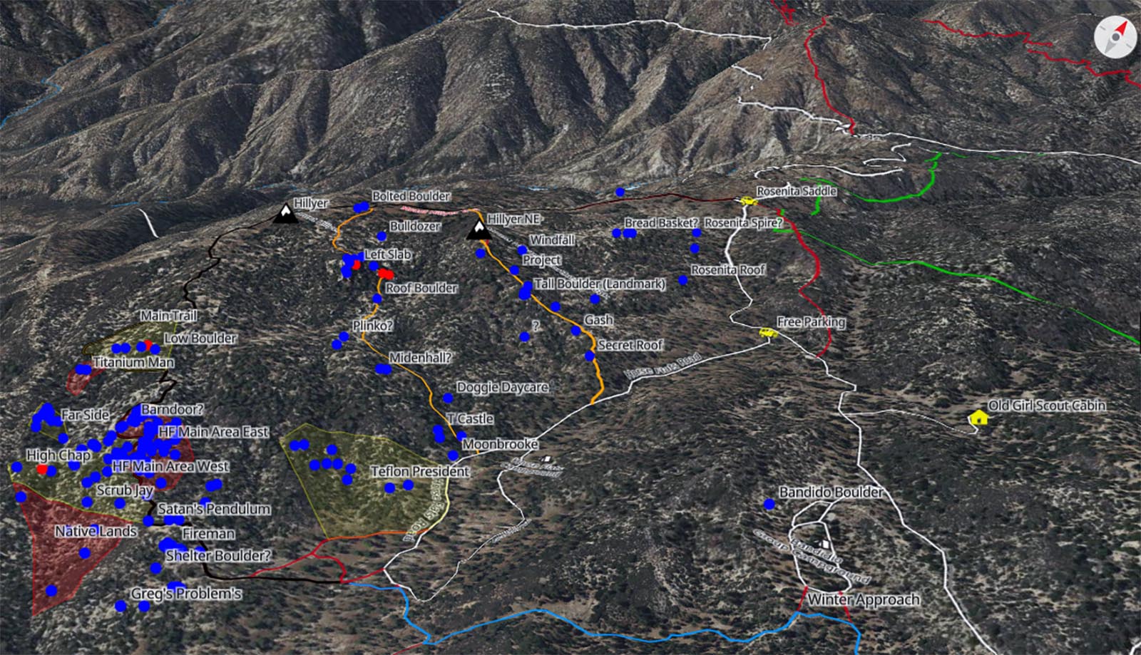 In 2005 Joan Bertini and Paisley Close published "5 Star Bouldering in Southern California." This guide featured (black and white) photos of the boulders, which was a first for a Horse Flats bouldering guide. The most important contirbution this book made was adding letter names to boulders. I have ultimately chosen to mostly ignore the letter names and chosen names based on their most popular problem, general location, or some other attribute/discriptor, or I have reverted to earlier names from the Craig Fry book. Bertini and Close may have listed Kody Shutt's 2024 V10 Knuckle Dragger as a V? project! The maps in the 5 Star book are often confusing and innacurate. The map in the James March guide is more accurate.