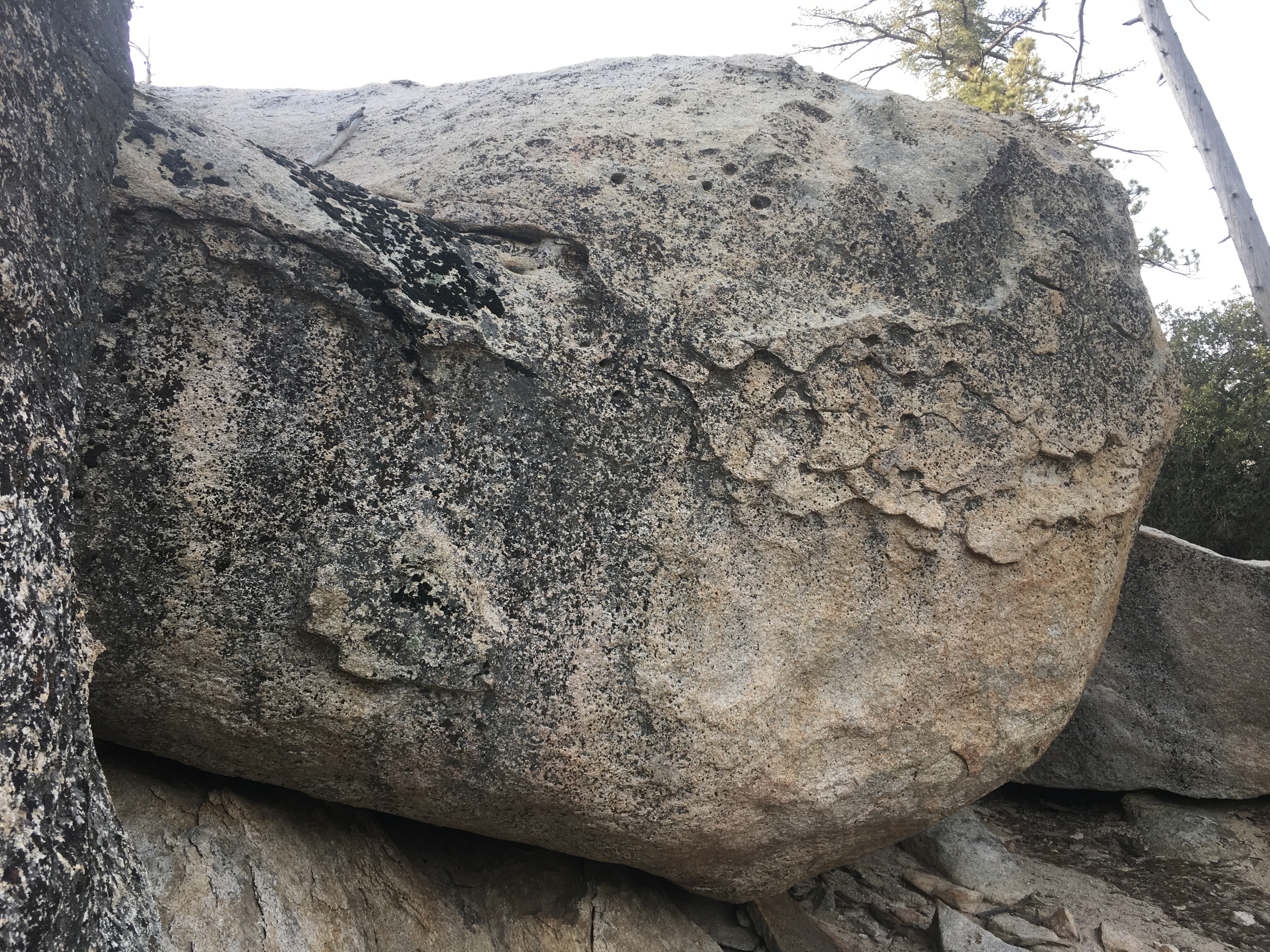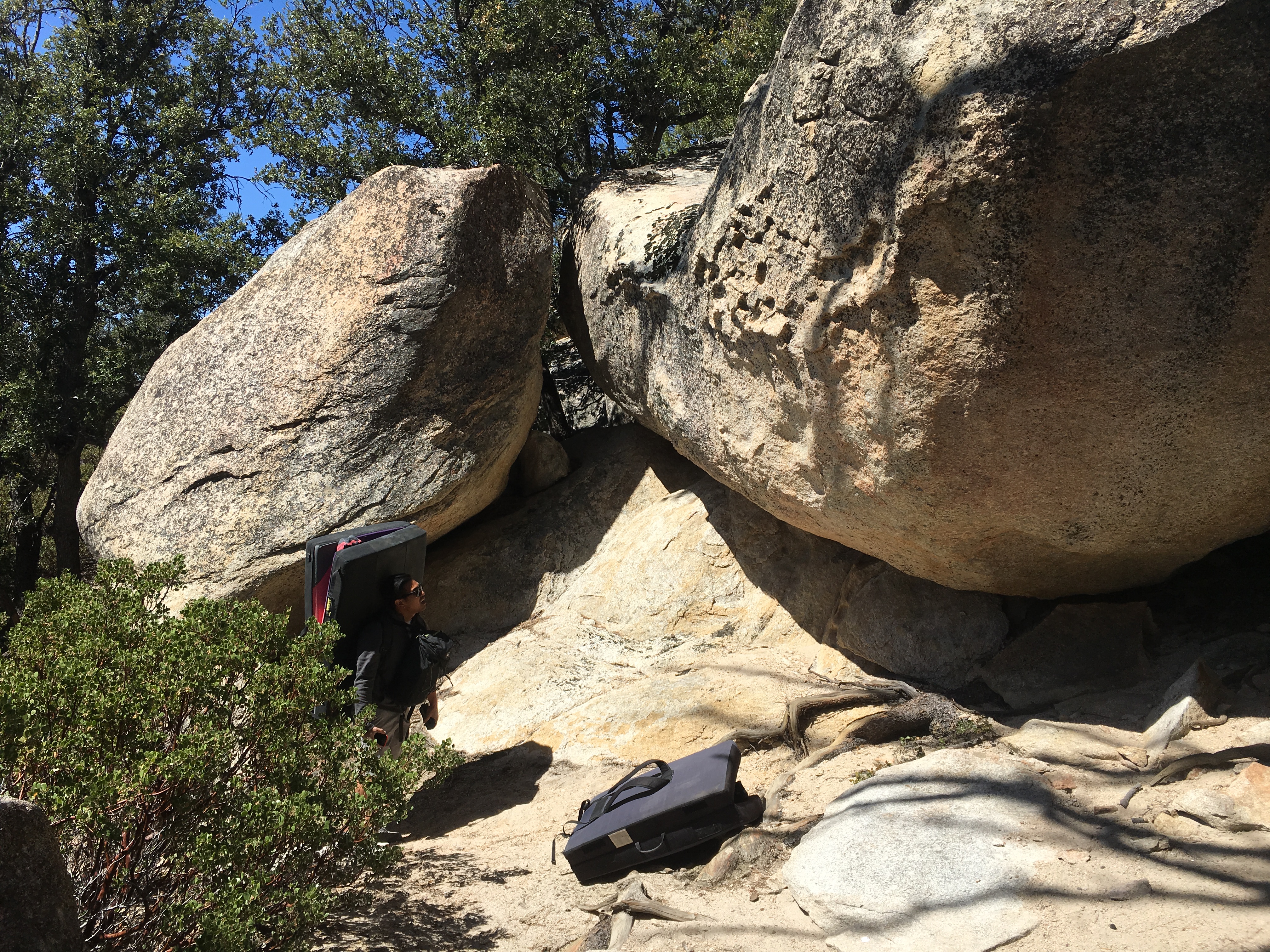 The front of the boulder has two padstack/jumpstart problems. The back has Big Man on Campus. Accross from Big Man, on a different boulder, I have always noticed a glued on hold. I wonder if that was some undocumented project? This is called the "D" boulder in the "5 Star" guide.