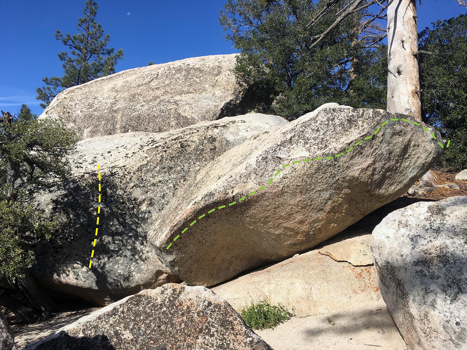 Desceptively hard traverse, tucked away in the middle of the Main Area. Also, behind Cheek to Cheek, on a seperate boulder, there is a nice beginner problem (V0). Cheek to Cheek is problem number 12 in the James March rock & Ice guide, "(V4) Sit-down lip traverse to sit-down finish." What a unique concept for a boulder problem!