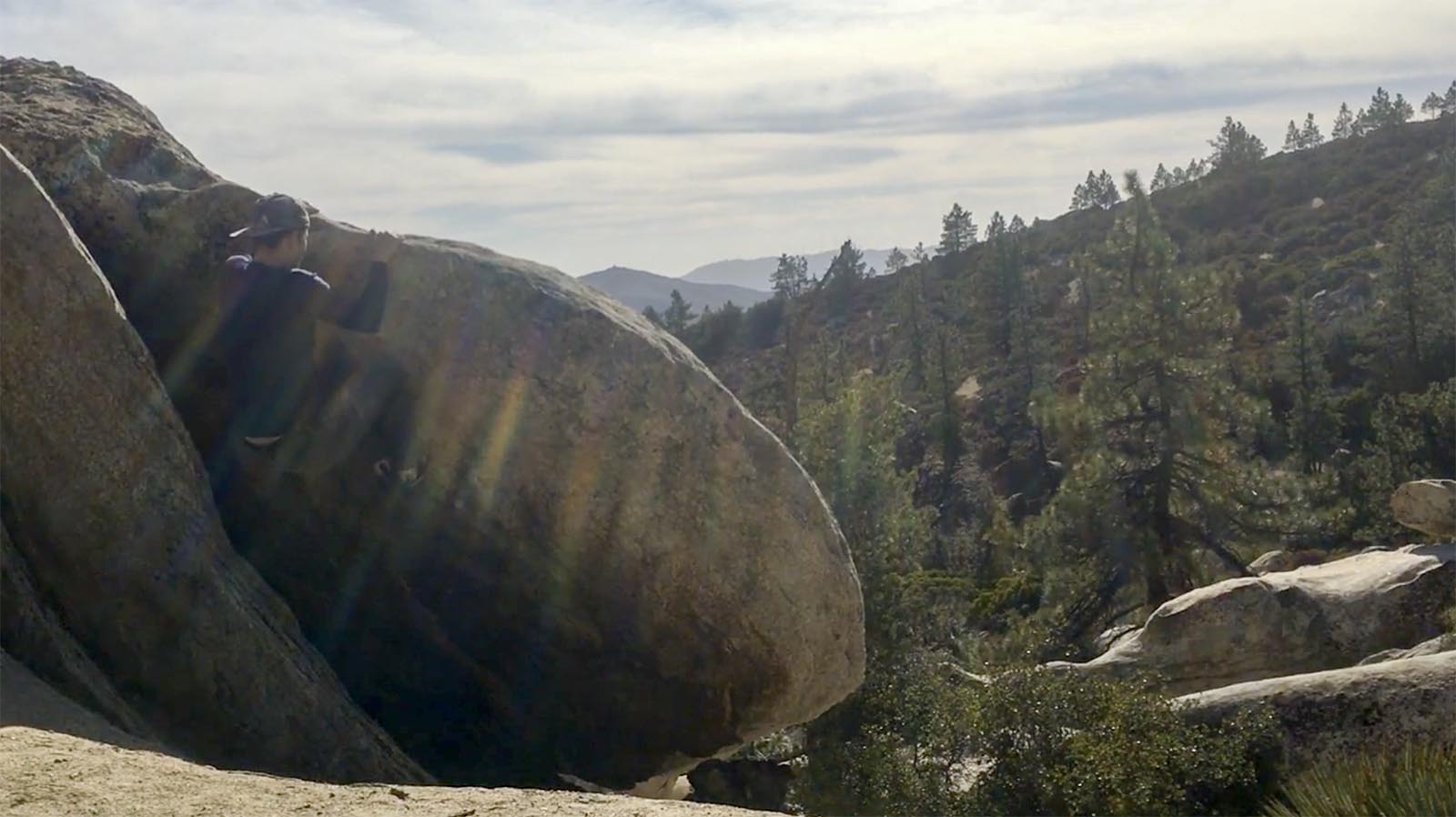 Traverse right to left and then mantle. On a little boulder climber's right of The Fang.