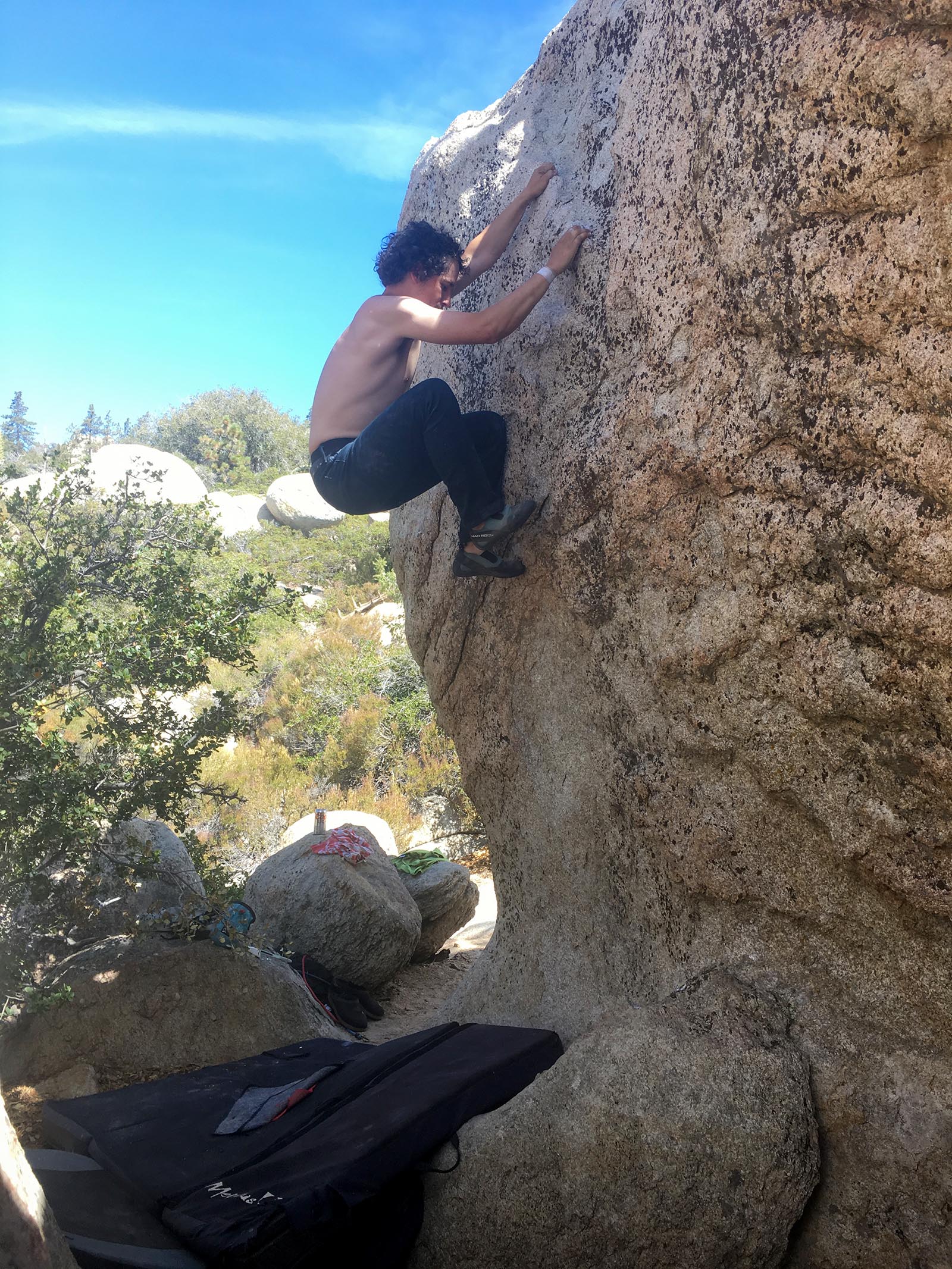 Accross from Opposition Movement in the same corridor. Sit start if you want. Face climb and top out on The Fridge boulder.