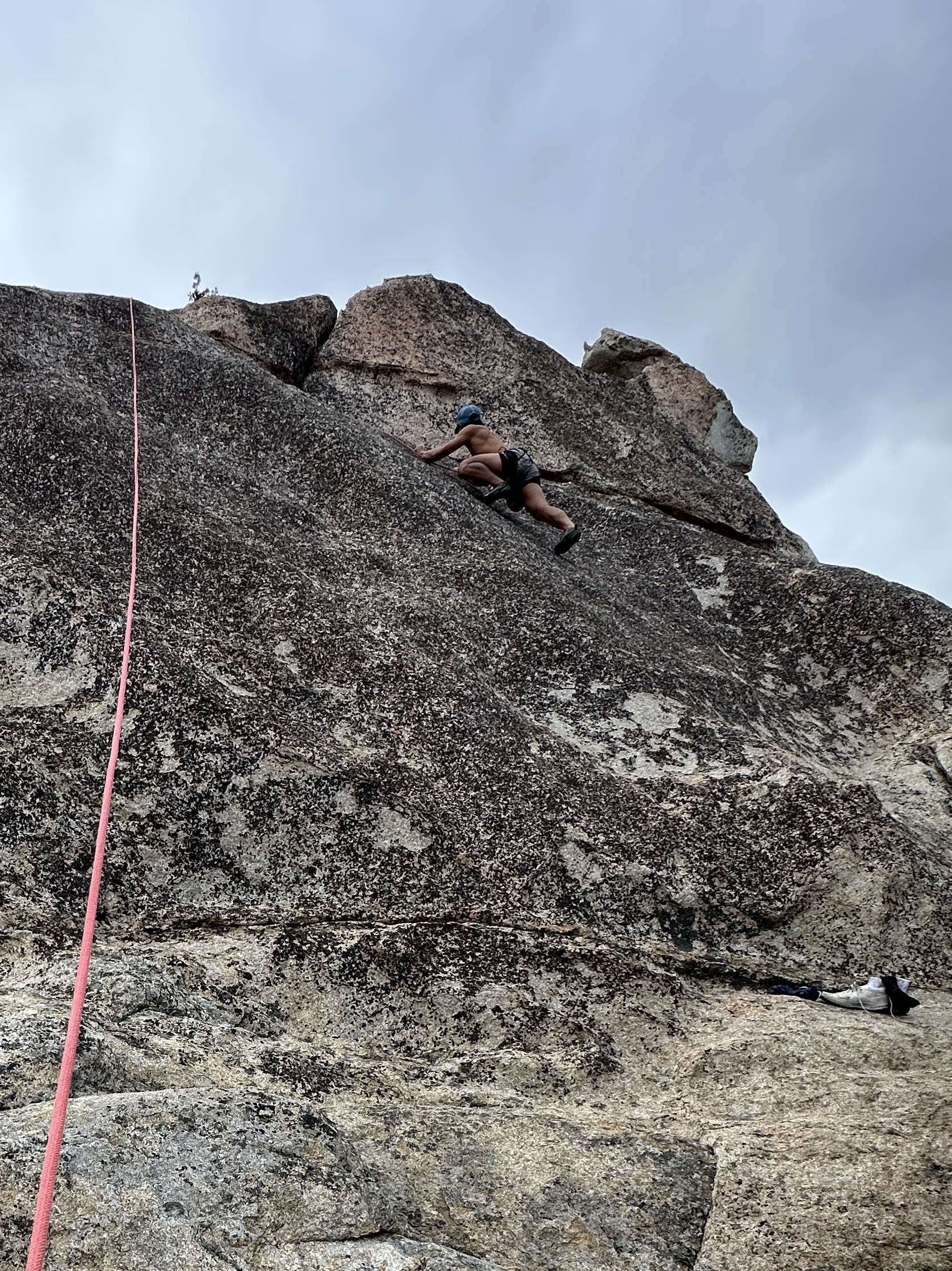 Start standing on a piar of nice ledges and go up straight. Start trending left keeping your feet above the very difficult face climbing. Aim for the hand crack and either traverse left and finish there or go up the hand crack. Optional ending variation climb up the slab without using the crack.