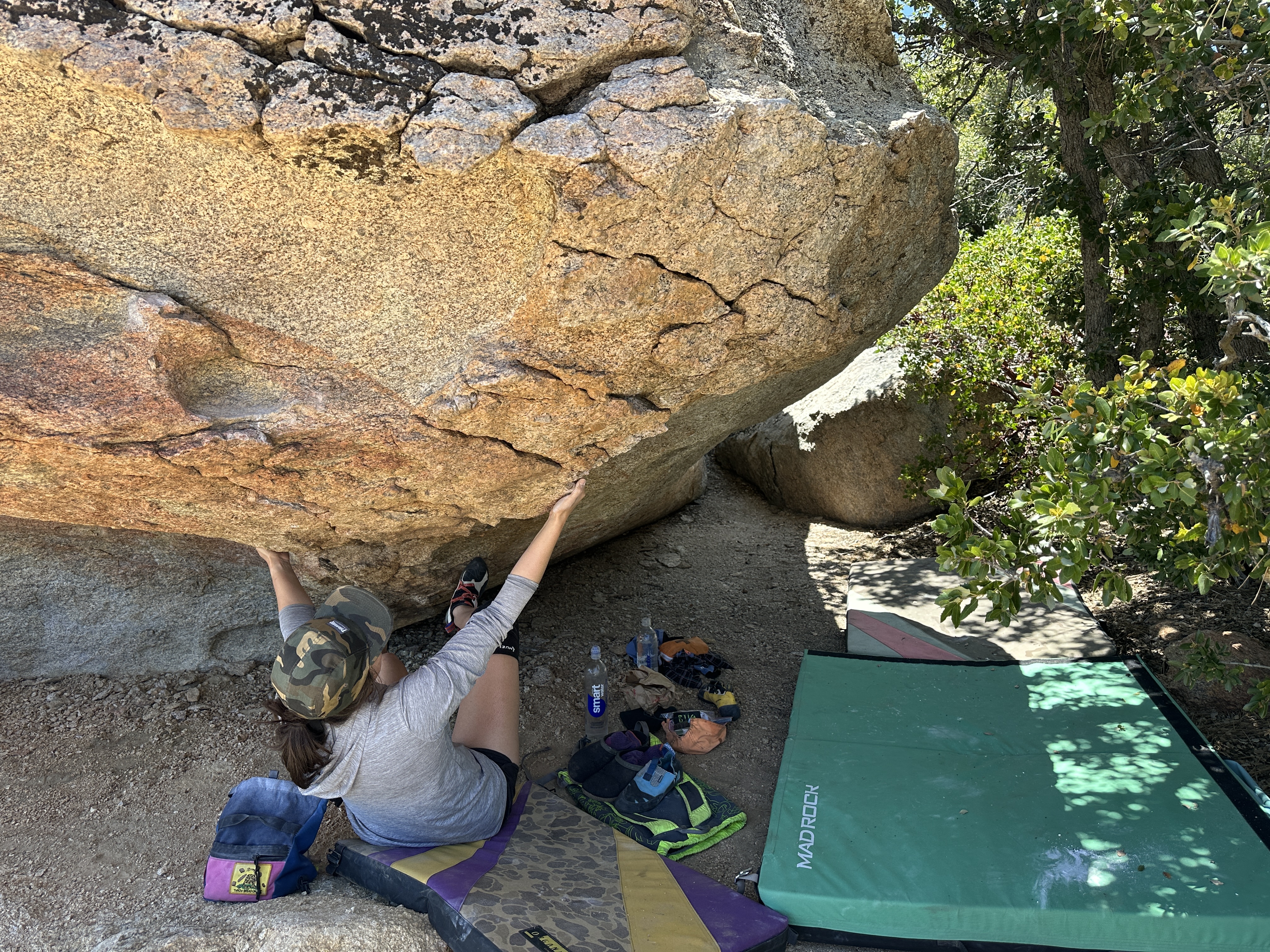 Sit Start. Climb up and traverse right, turn the corner, and mantle when you get to the crack. Below you can see the climber starting with a left undercling and a right juggy sidepull. Slightly easier start one move in (with a higher left and the same right) that you can still start fully sitting. Also possible to add a move and start lower than this photo.