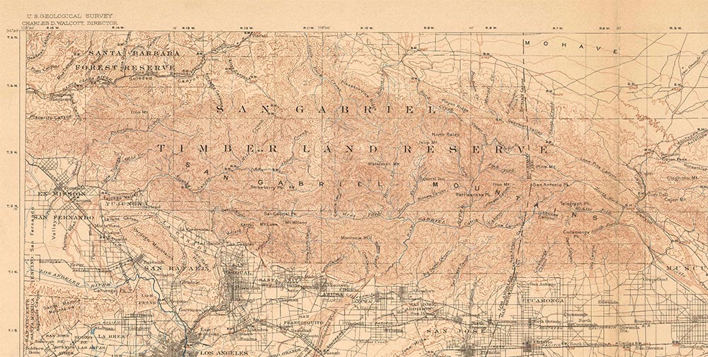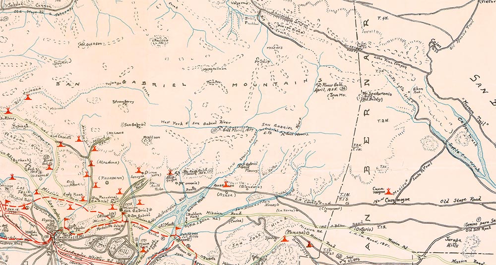 If you know the area well, you can see a lot in this map. Visible is the old path from Clear Creek to Red Box, Red Box to the Chilao/Horse Flats/Newcombs area, from there the trail heads east (right) and passes Winston, Waterman, Mt. Akawie/Buckhorn, towards Islip. The trails stop here, although Will Thrall wrote about a trail that went from Windy Gap/Islip north in to the Big Rock Creek and on towards the desert.