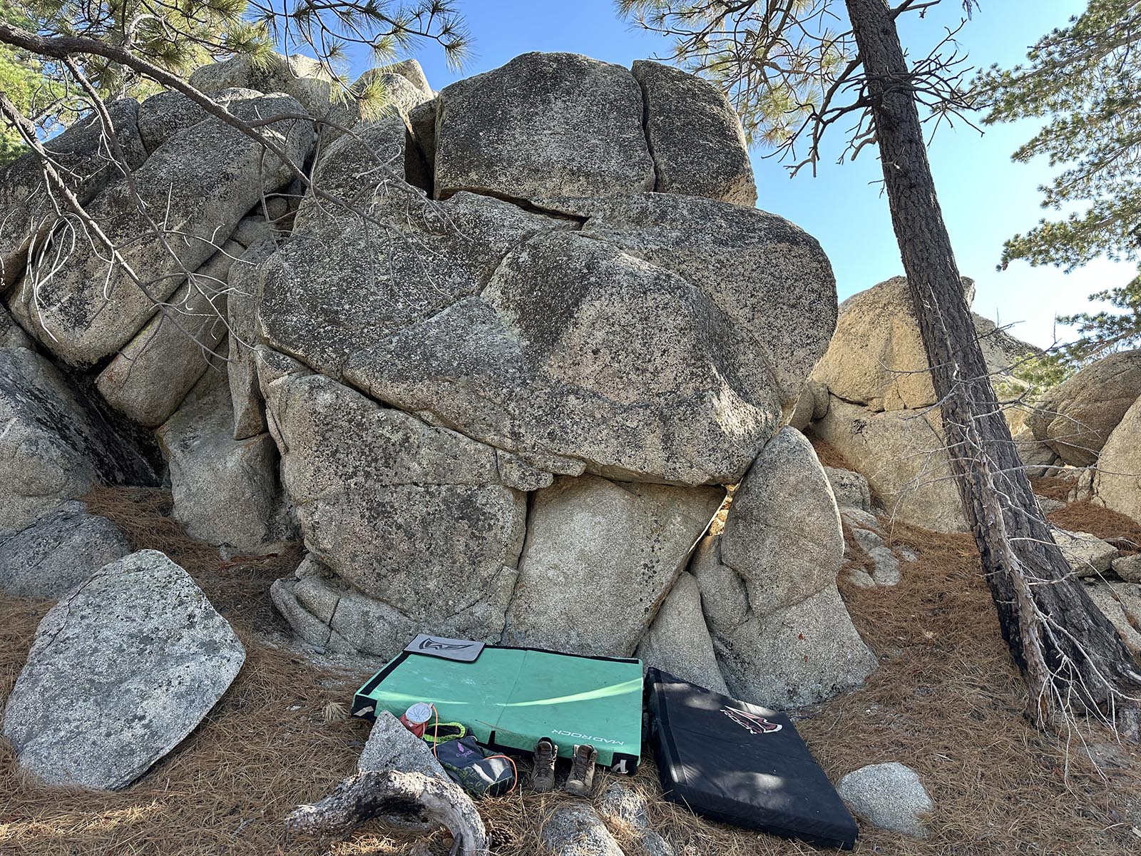 You can start this boulder with a easy stand or a challanging sit that uses a right hand in the lowest crack and a left hand on a very small ledge. There's probbaly a hard funky mantle to the right.