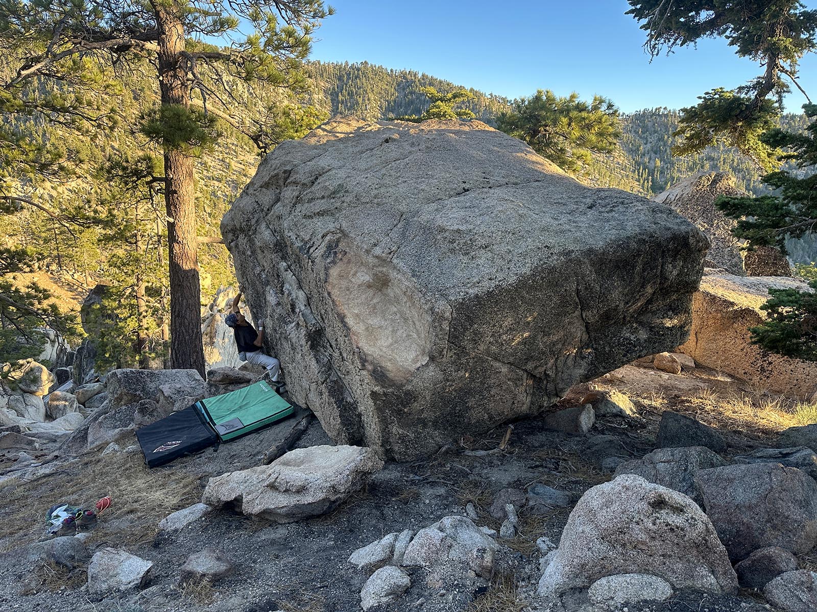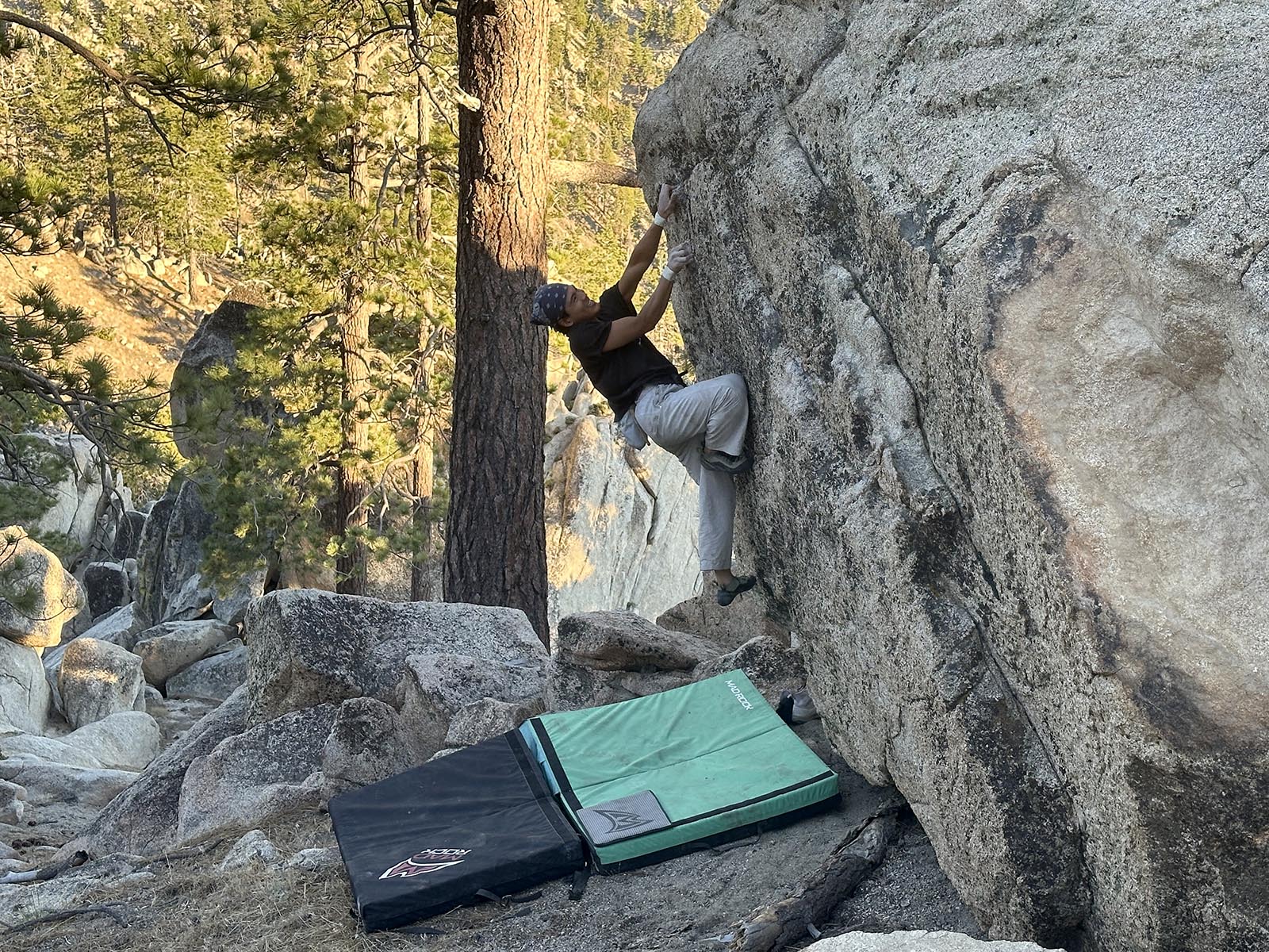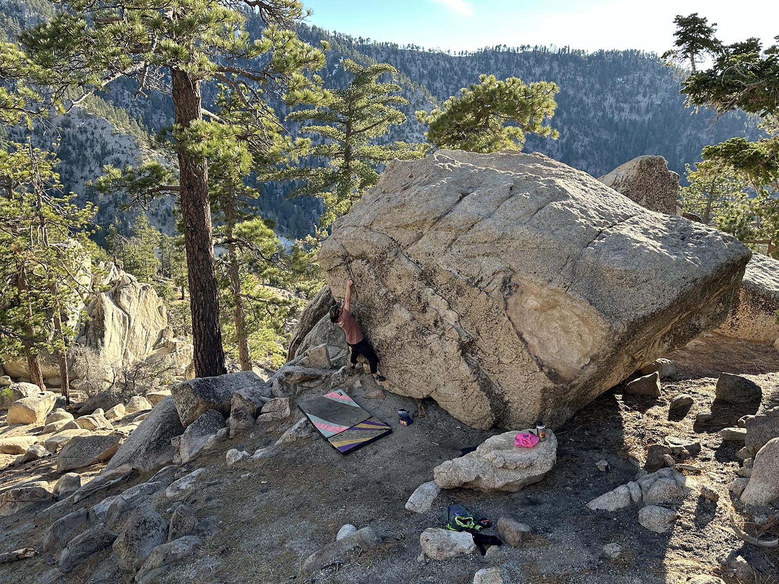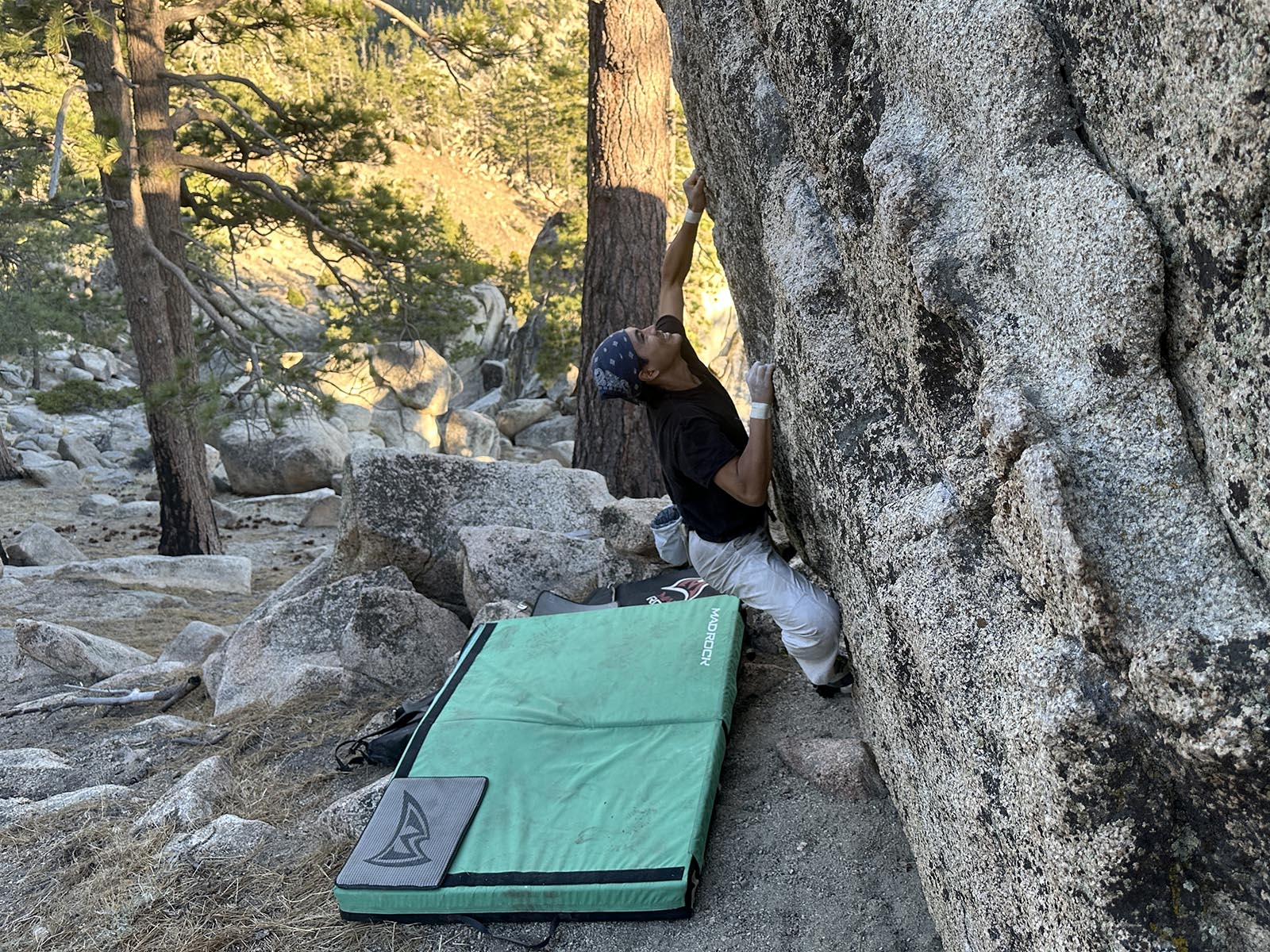 With one pad under you, left hand is above the head, right hand is shoulder height. High or low left foot, right foot on a shelf. Gently move to a right side pull. First move is the crux. Can also be done as a jump start (much easier).