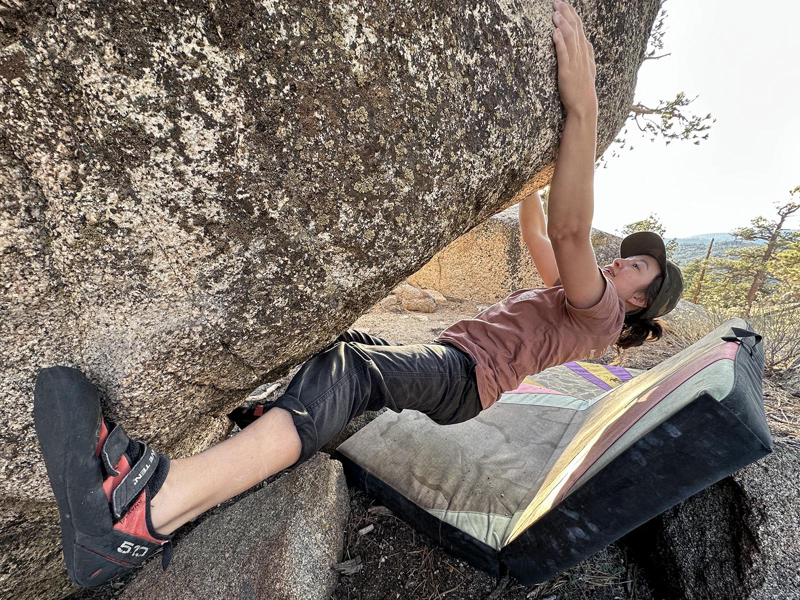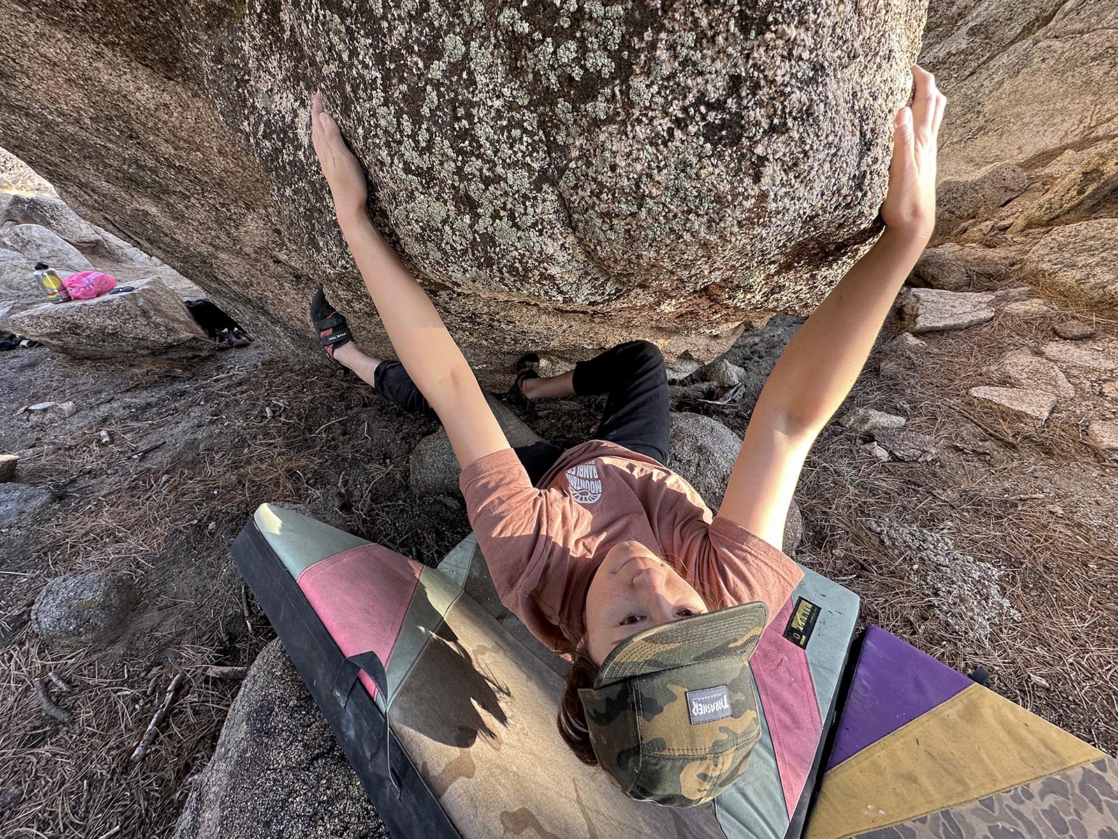Sit start compression on the lowest hand holds. Left toe hook. Right foot on a low shelf. Move your left and right hand up a move, swing the feet over and get a right heel hook and finish the problem out. Hardest problem on the boulder so far.