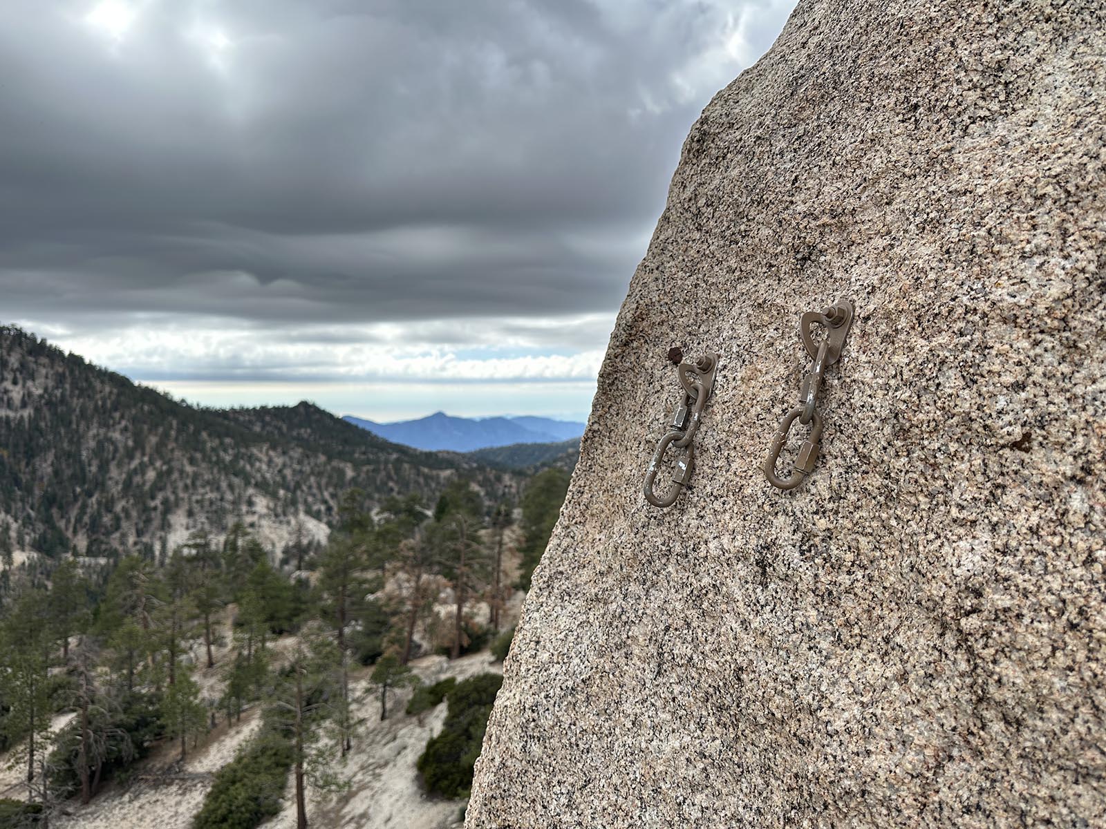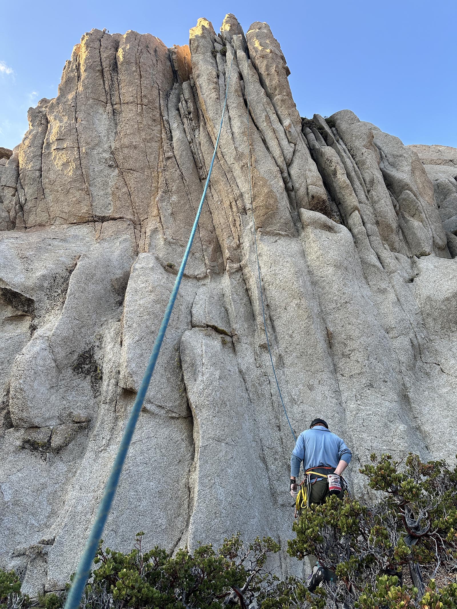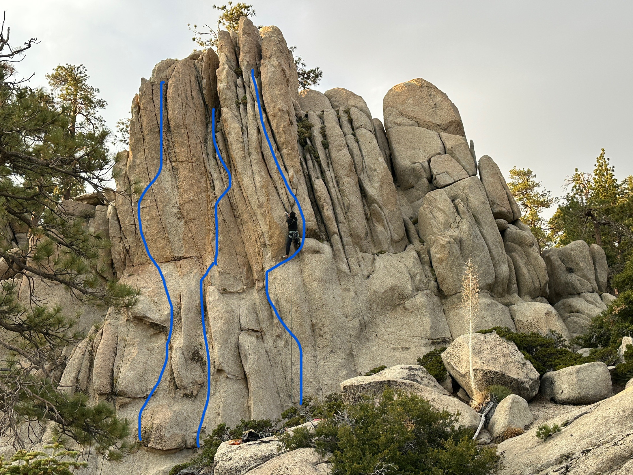 Starts with stemming that is easier than it looks. Climb into a dihedral and traverse right towards the two large cracks. Use the cracks to climb towards two bolts. For TR use a ramp that's climbers left around the formation. This climb will get much better after some cleanings and some laps. If you want to TR from the bolts you need 40m (30m doesn't reach the ground).