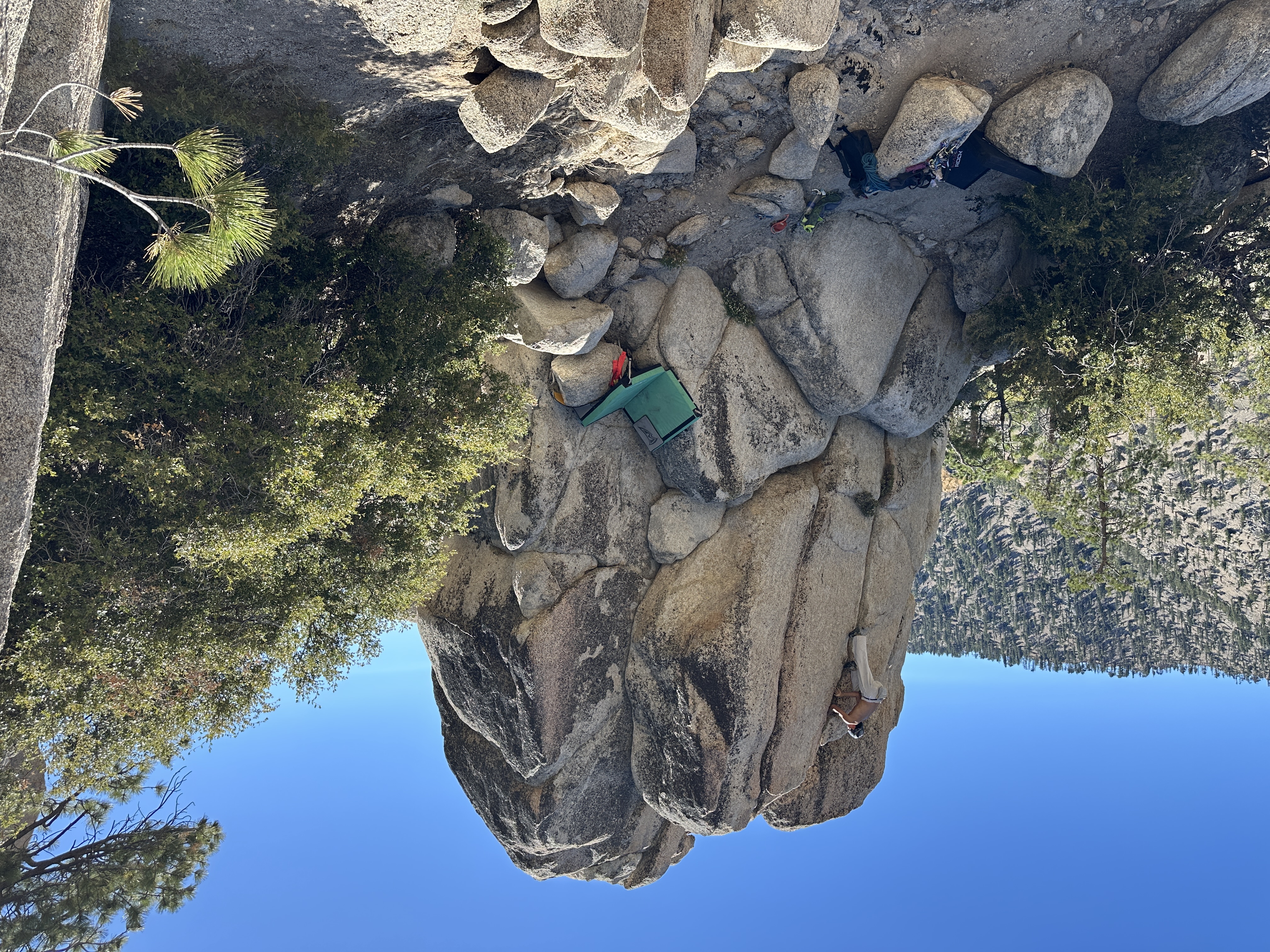 Geoffry Gonzales downclimbing left crack on July 2025.