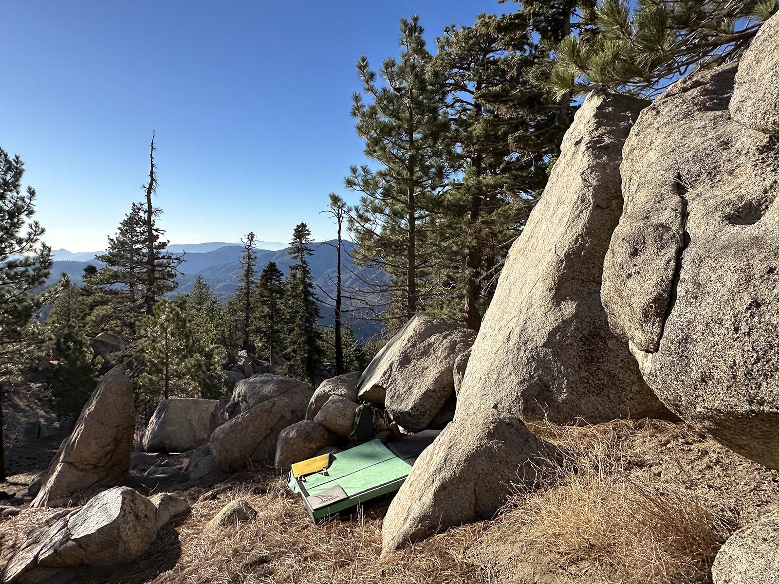 25° Slab problem accross from Lance's Boulder that's near the flat clearing. Climb the slab and gently top out at the apex in to some branches of a healthy pine tree.