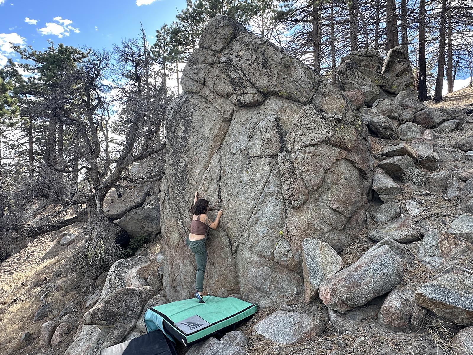 On the main trail, on the right, past The Triangle Boulder (Shabaz) and the Trailside Cluster (left of main trail).