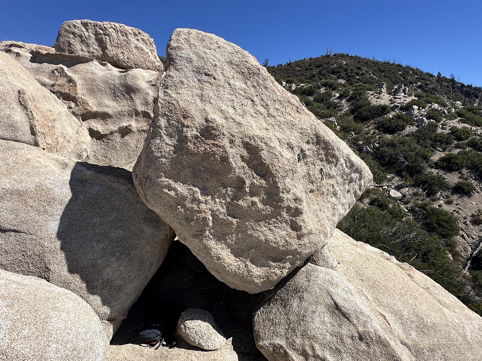 There are two bolted anchors on top of this formation. You can lead up to them or walk around the back. Pictured are the left anchors (as of October 2025 they have 2 quicklinks on each hanger) for Walk on the Mild Side to Worth Bagley was a Bitch. Right anchors are for Coarse and Bulgy to Flail Away.