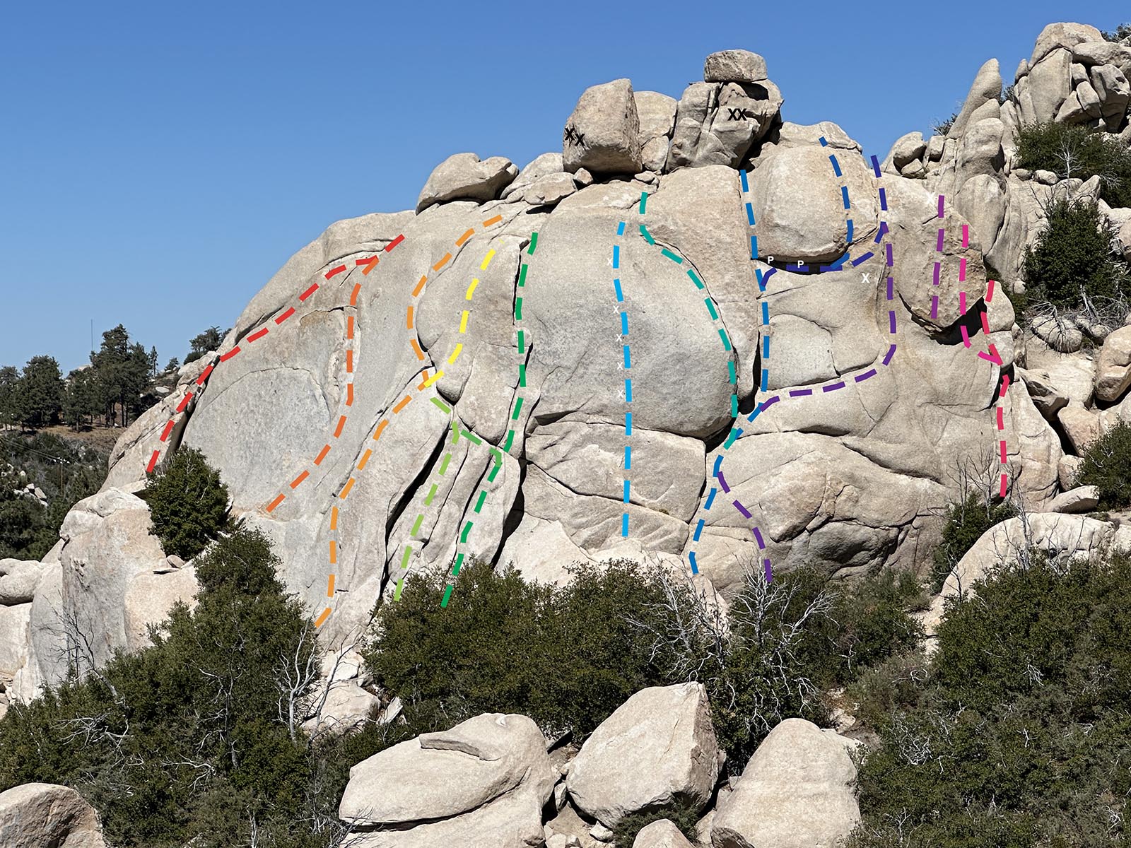 Fictitioua Tree is fun. This is a good spot for top roping and trad climbing. You can scramble (Class 2/3) up the back (right side) and set top ropes for almost all of the routes. You can top rope some of these routes without any trad gear, but some of the peripherial routes need a cam or nut, and some routes (Walk on the Mild Side) should really just be lead and followed.
